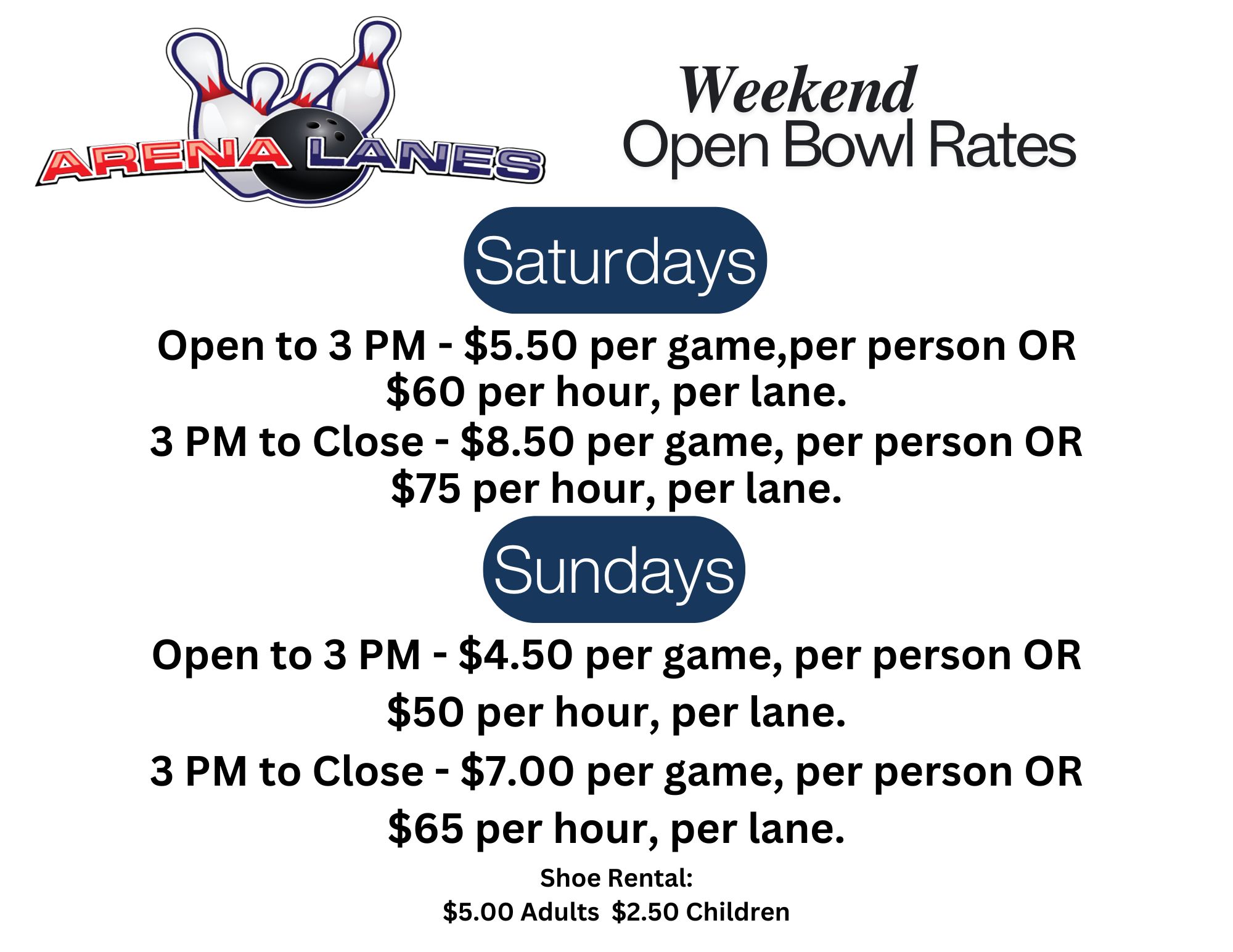 OPEN BOWL PRICES - ALL PRICES NOT VALID ON HOLIDAYS - PLEASE CALL FOR AVAILABILITY
